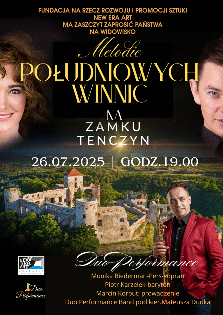 MELODIE POŁUDNIOWYCH WINNIC NA ZAMKU TENCZYN 26 lipca 2025 (sobota) Godzina: 19:00 Zamek Tenczyn, Rudno W samym sercu malowniczego Jury Krakowsko-Częstochowskiej, gdzie ruiny średniowiecznego Zamku Tenczyn skąpane są